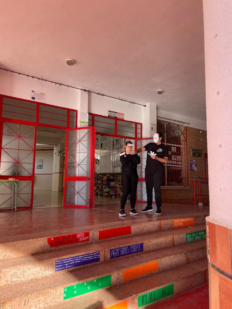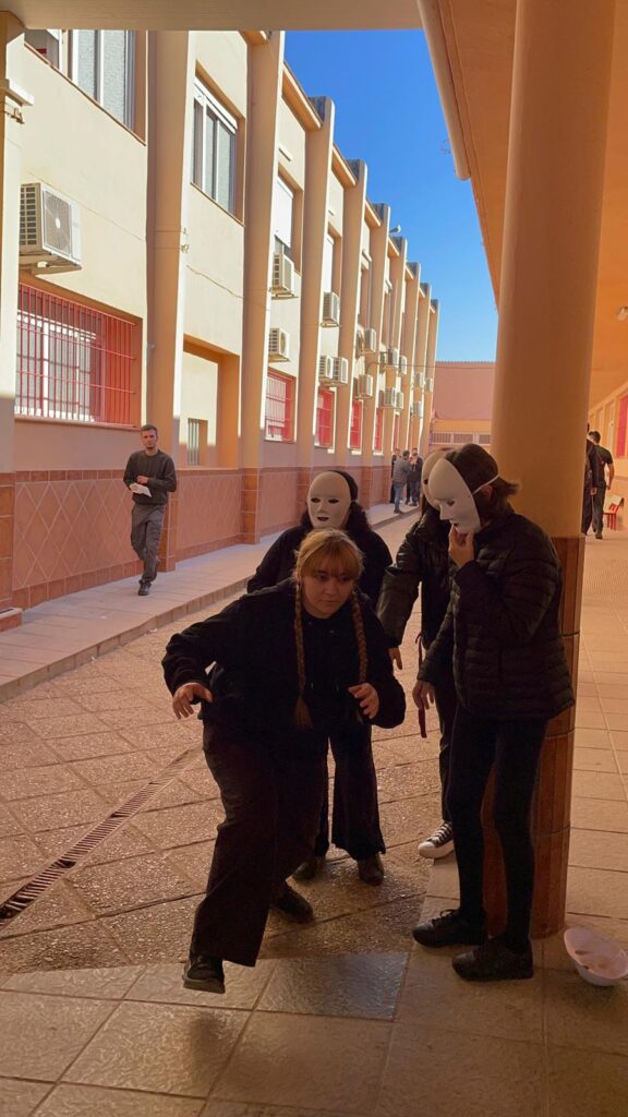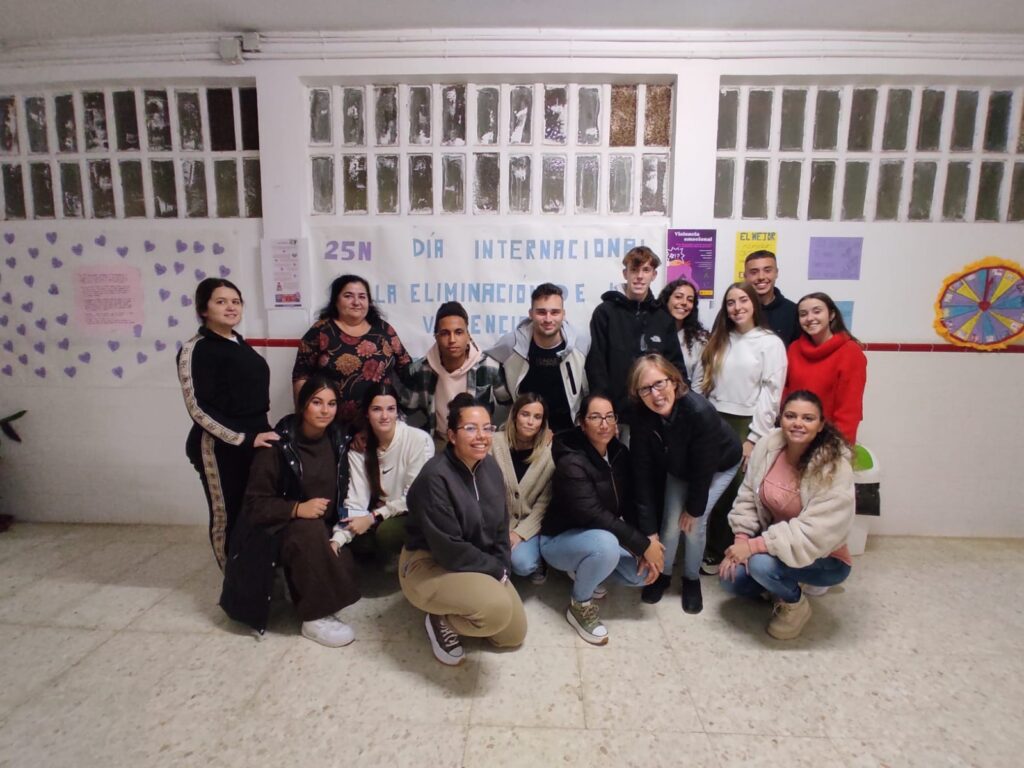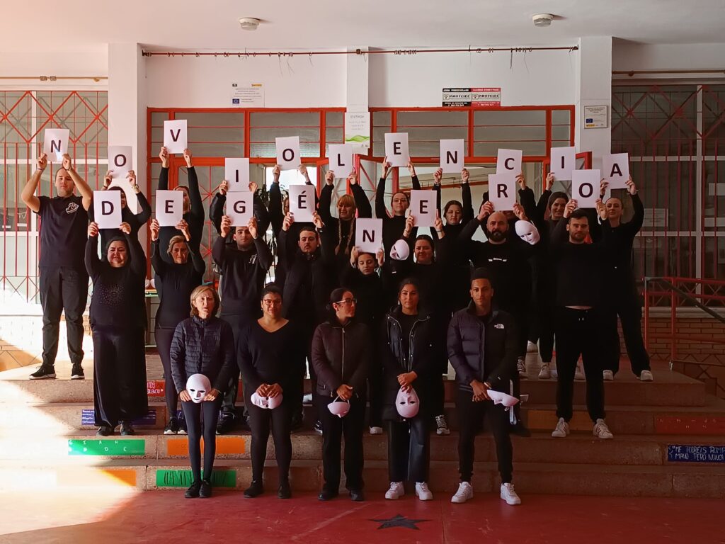 Y hoy, como broche final de las actividades, el alumnado del CFGS Promoción de Igualdad de Género y el CFGS Integración Social han realizado una performance sobre los tipos de violencia, sensibilizando así, a alumnado y profesorado durante las horas del recreo. Esta actividad ha culminado con la lectura de la cifra de mujeres asesinadas del presente año, haciendo especial mención a que la violencia de género se manifiesta de múltiples formas y, recordando, el teléfono de denuncia de la Delegación del Gobierno contra la violencia de género 016.